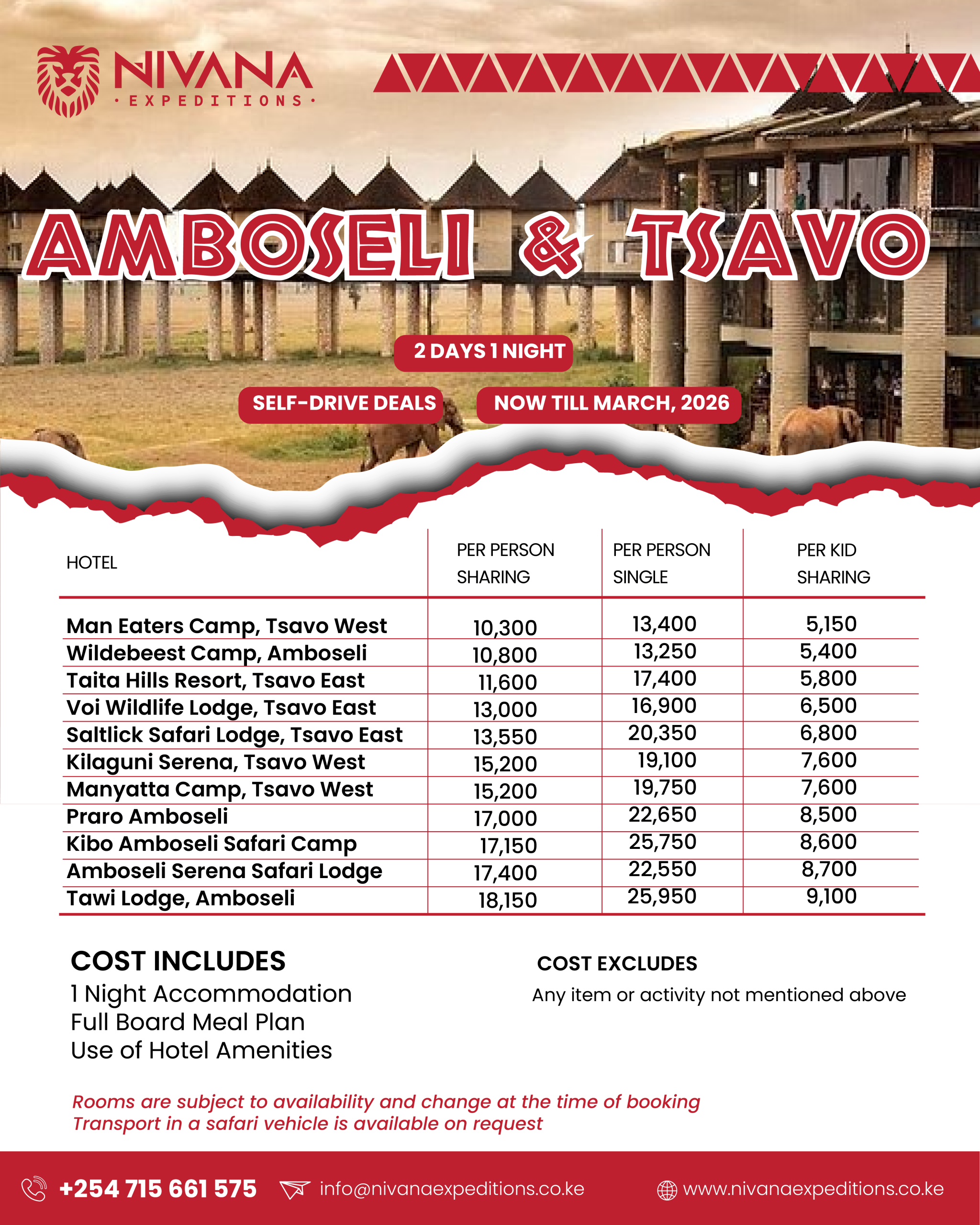 Escape the city and experience a short yet unforgettable wildlife adventure to two of Kenya’s iconic safari destinations; Amboseli National Park and Tsavo National Park.