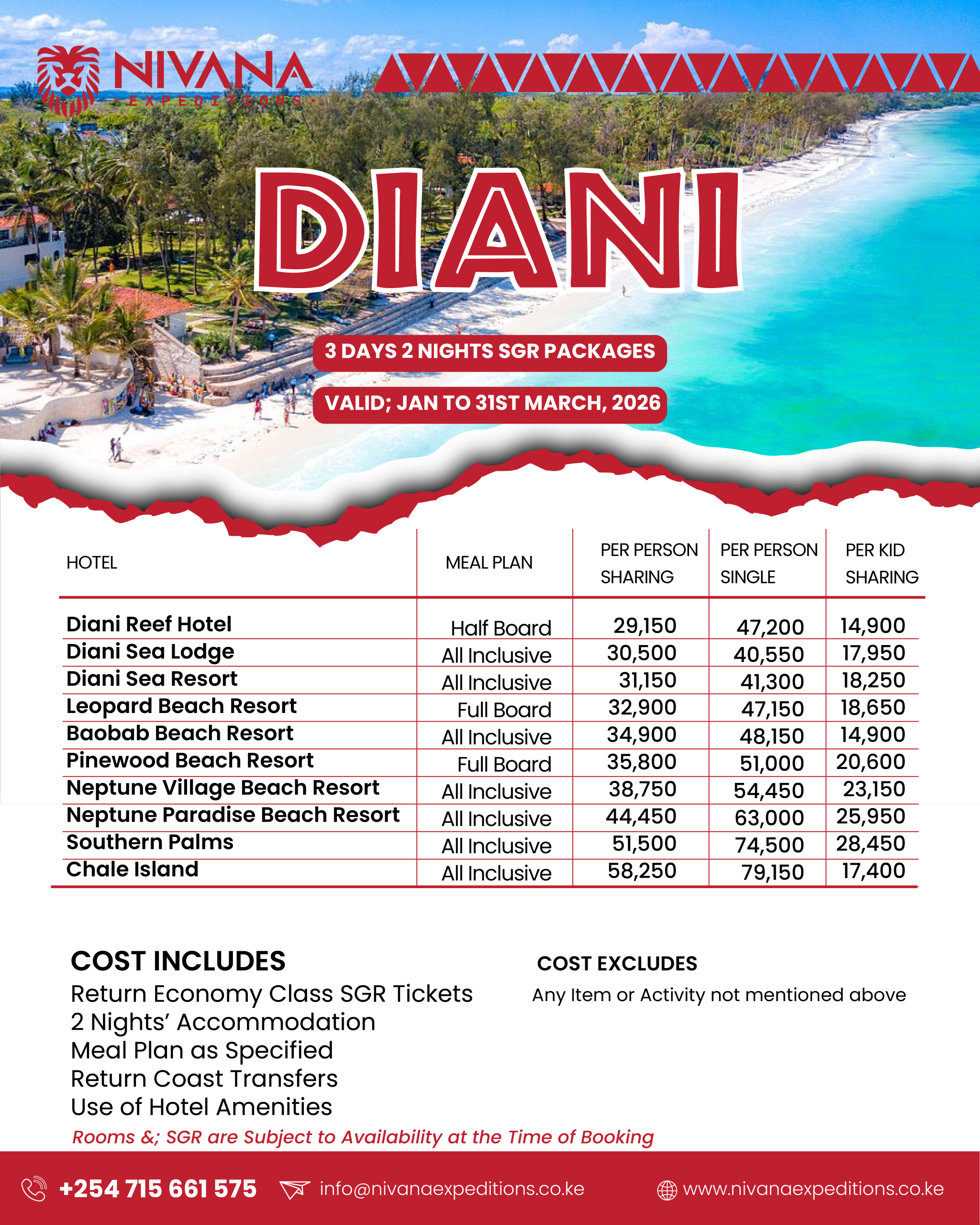 3 DaysWhether you’re looking to relax by the turquoise waters of the Indian Ocean, enjoy water activities, or simply unwind under the palm trees, Diani provides the perfect tropical getaway.